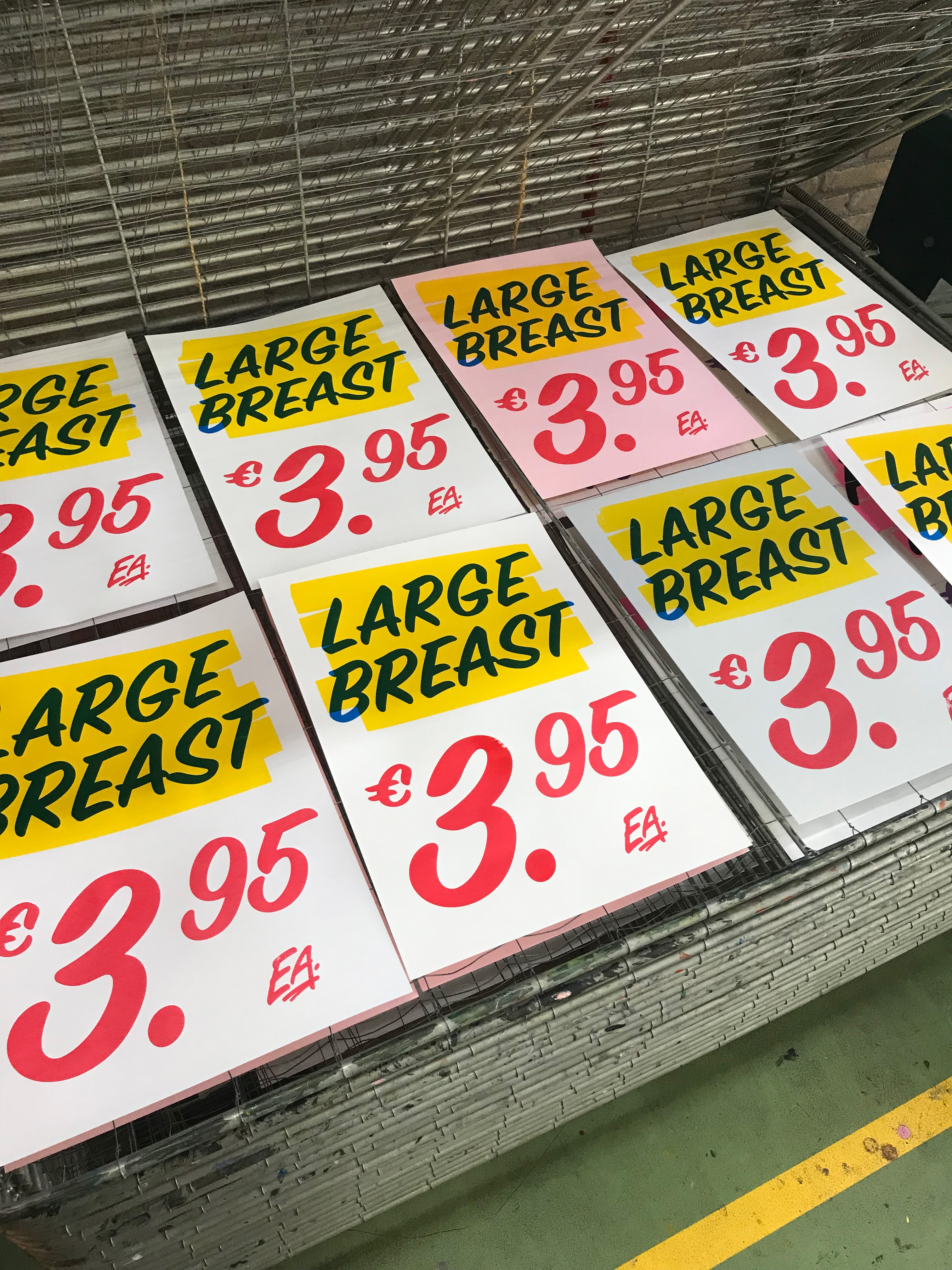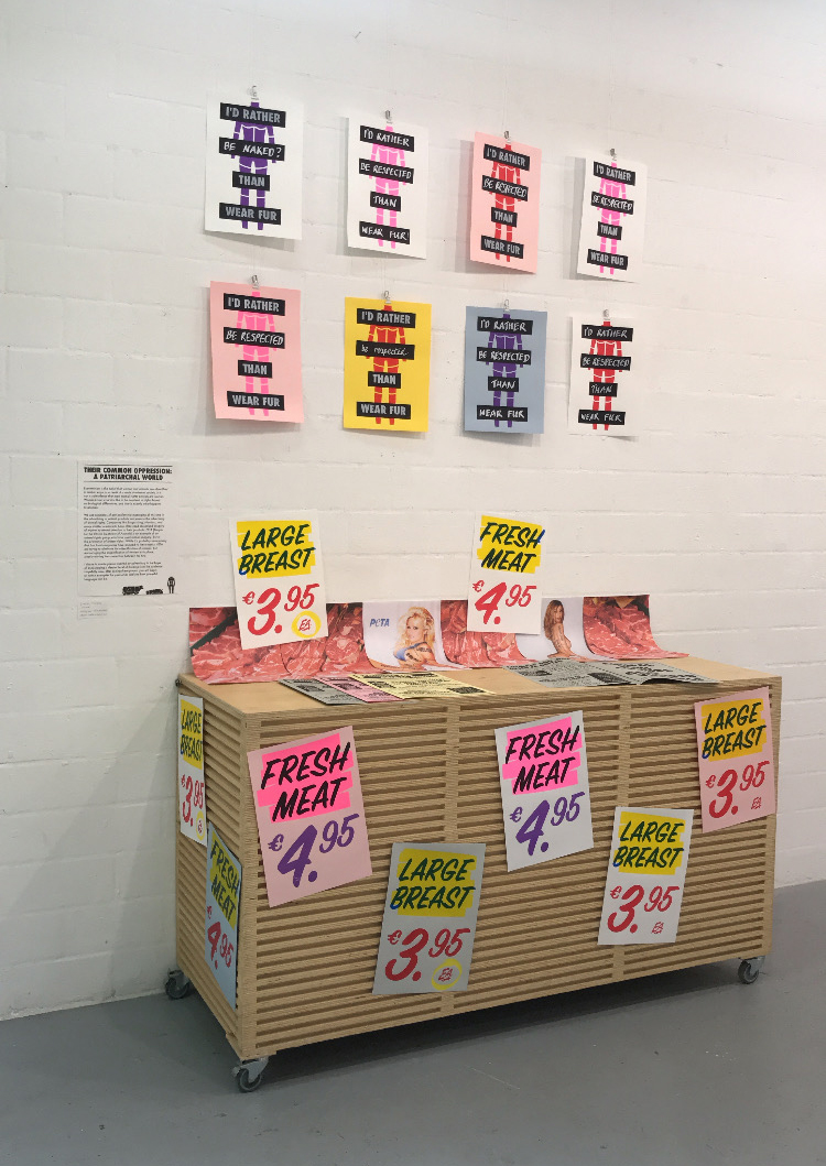 I chose to create a “meat shop” setup for my display to put my prints in context. I had images of meat beside PETA campaigns and my own prints surrounding them promoting ‘fresh meat’ and ‘large breasts’. My own take on the PETA campaign ‘I’d Rather Go Naked Than Wear Fur’ was displayed on the wall above, replacing ‘go naked’ with ‘be respected’. I included an extra element of a newspaper layout as well. I used newspaper headlines from journals of the Feminists for Animal Rights group, who were active in the 90’s, as a homage to their work.